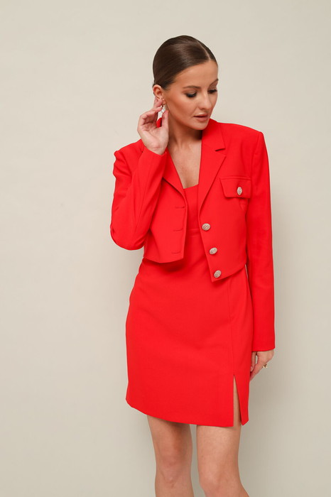 Комплект 2-предметный, состоящий из жакета и платья. Укороченный жакет полуприлегающего силуэта с центральной застежкой на петли и пуговицы. Воротник пиджачного типа с отложными лацканами. Перед жакета с накладными клапанами с пуговицами. Рукава втачные двухшовные. Спинка с талиевыми вытачками. Изделие на подкладке. Платье прилегающего силуэта в длине мини, с отрезным лифом и вытачками. Нижняя часть с вертикальным швом переходящим в разрез. Спинка отрезная с вытачками, с застежкой в среднем шве на потайную тесьму-молнию. Платье обработано хлопковой подкладкой.