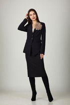 Блузка и юбка, выполнены из вискозного полотна. Блузка прямого кроя, горловина с рубашечным воротником на отрезной стойке, центральная застежка на петли и обтяжные пуговицы. Рукава втачные с манжетами с застежкой на пуговицы. В боковых швах обработаны разрезы. Спинка с отрезной кокеткой и встречной складкой.