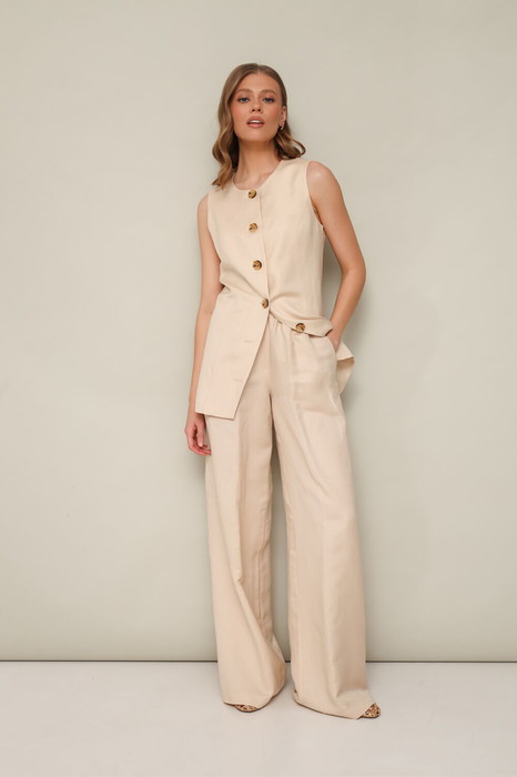 Стильный 2-предметный костюм, состоящий из жилета и брюк, выполнен из натурального льна. Жилет актуального прямого силуэта с центральной застежкой на петли и пуговицы. В рельефных швах спинки обработаны завязки для регуляции прилегания жилета. Брюки прямого силуэта с притачным поясом на резинке и боковыми наклонными карманами. Спереди брюк - имитация гульфика.