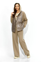 Жакет прилегающего силуэта, слегка расширенный к низу. Горловина с цельнокроеной стойкой и V-образным вырезом. Центральная застёжка на потайные пришивные кнопки с декоративными акцентными пуговицами. Рукава втачные, двухшовные. Спинка с рельефами и средним швом.