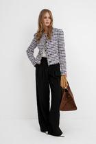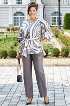 Комплект женский, состоящий из жилетки и брюк. Жилетка полуприлегающего силуэта, выполнена на одно плечо, длиной чуть выше линии бедер. Спинка со средним швом и рельефами. По переду рельефы, обработаны карманы с листочкой и клапаном. Жилетка без воротника. Застежка по переду на петли и пуговицы. Жилетку дополняет съемная регулируемая бретель. Жилетка на подкладке. Брюки прямого силуэта, на притачном поясе с резинкой по спинке. По задним половинкам талиевые вытачки. По передним половинкам обработаны боковые карманы с наклонным входом, и застежка на тесьму-«молнию» с гульфиком и откоском. По поясу застежка на петлю и пуговицу.