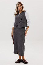 Комплект женский, состоящий из блузки и юбки. Блузка свободного кроя, длиной ниже линии бедер. Спинка со средним швом, в котором по горловине обработана застежка на навесную петлю и пуговицу. По переду нагрудные вытачки. Блузка без рукавов. Горловина округлой формы. блузку дополняет съемный пояс. Юбка А-образного силуэта, длиной чуть ниже щиколотки. Верхний срез юбки обработан резинкой.