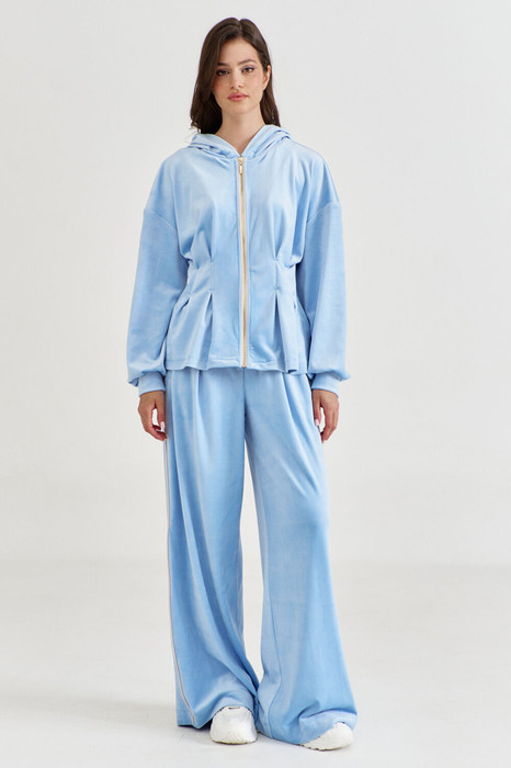 Костюм, состоящий из джемпера и брюк. Джемпер полуприлегающего силуэта, длиной до бедер. Прилегание по талии достигнуто за счет встречных складок. Рукава одношовные, втачные, по низу с притачной манжетой. По горловине вставлен капюшон. По переду застежка на декоративную тесьму-«молнию». По молнии вставлен кант из контрастной ткани. Джемпер без подкладки. Брюки длинные, расширенные к низу, на притачном поясе с резинкой. На передних половинках заложены встречные складки и обработаны карманы с листочкой. В боковые швы вставлен кант из отделочной ткани. Брюки без застежки.