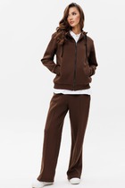 Костюм женский предназначен для повседневной носки. Костюм женский 2-х предметный блузка и юбка-брюки. Блузка женская прямого силуэта, длиной до линии бёдер. Перед с 2-мя нагрудными вытачками. Спинка с отрезной кокеткой, с 1-ной встречной складкой, кокетка декорирована пришивной металлической пластиной. Боковые швы с разрезами. Горловина круглая, обточная, без воротника. Рукав втачной одно шовный, короткий, с приточной отложной манжетой. Блузка без плечевых накладок. Юбка-брюки длинные широкие. Передние половинки с карманами в боковых швах с 2-мя односторонними зафиксированными складками на каждой половинке. Задние без конструктивных особенностей. Пояс притачной, собран на эластичную тесьму, закреплённую 2-мя отделочными строчками. Длина брюк по боковому срезу 90 см. Длина спинки блузона 56 см, длина рукава 22 см.