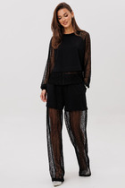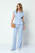 Костюм женский, предназначен для повседневной носки. Костюм женский, 2-х предметный блузка и брюки. Блузка женская, удлинённая прямого силуэта, длиной до середины колена. Перед с 25-мя нагрудными вытачками, выходящими из плечевых швов, с 2-мя накладными прямоугольными карманами на уровне груди, левый декорирован пришивным украшением, с 2-мя притачными вертикальными планками по горловине и краю борта. Спинка с отрезной кокеткой и встречной складкой по центру. Горловина с V-образным фигурным вырезом с втачным воротником рубашечного типа с отрезной стойкой. Застёжка центральная на 5-ть вертикально-обмётанных петель и 5-ть пришивных пуговиц. Боковые швы с высокими разрезами. Рукав втачной одно шовный длиной 7/8 с патой, фиксирующейся на пришивную пуговицу и регулирующей длину рукава. Блузка с плечевыми накладками. Брюки женские прямые широкие длинные. Передние половинки с карманами в боковых швах с отрезными бочками. Задние половинки с таллиевыми вытачками. Брюки с притачным поясом, собранным на эластичную тесьму, закреплённую 2-мя отделочными строчками. Длина брюк по боковому срезу 106 см. Длина спинки туники 100 см, длина рукава 50 см.