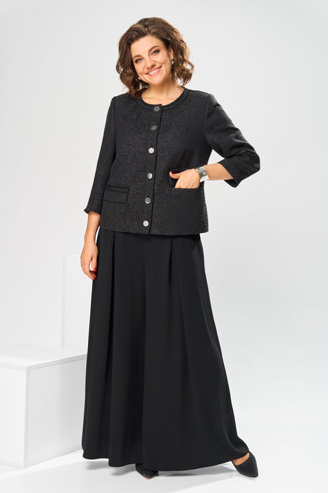 Костюм женский относится к нарядной торжественной одежде. Костюм женский 2-х предметный жакет и брюки. Жакет женский полуприлегающего силуэта, длиной до линии бёдер. Перед с 2-мя нагрудными вытачками с притачными планками по горловине, декорированными надстрочной отделочной тесьмой, с 2-мя надстрочными вертикальными планками, с 2-мя прорезными карманами с клапаном с закруглёнными концами и листочкой, клапан декорирован надстрочной отделочной тесьмой, карманы расположены ниже линии талии на 2 см. Спинка с 2-мя таллиевыми вытачками и средним швом. Горловина круглая, обточная, без воротника. Застёжка центральная бортовая на 6-ть вертикально обмётанных петель и 6-ть пришивных пуговиц. Рукав 2-х шовный втачной, длиной 3/4. Жакет на притачной подкладке. Брюки женские, широкие, длинные. Передние половинки со встречными складками с карманами в боковых швах. Задние половинки без конструктивных особенностей. Брюки с притачным поясом, собранным на эластичную тесьму, закреплённую 2-мя отделочными строчками. Длина спинки жакета 58 см, длина рукава 48 см. Длина брюк по боковому срезу 99 см.