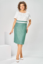 Костюм женский относится к нарядной торжественной одежде. Костюм женский, 2-х предметный жакет и платье. Жакет полу прилегающего силуэта, длиной до линии бёдер. Перед с 2-мя рельефами, выходящими из плечевых швов и до горизонтального надреза, шов притачивания рельефа, декорирован листочкой с бантом, закреплённым пришивной стразой. Спинка со средним швом и 2-мя таллиевыми вытачками. Горловина с фигурным вырезом, низ жакета с закруглёнными концами. Горловина обточная, без воротника. Застёжка центральная бортовая на 1-ну обмётанную петлю и 1-ну пришивную пуговицу. Рукав втачной , 2-х шовный, длиной 3/4. Жакет на притачной подкладке. Жакет с плечевыми накладками. Платье женское полу прилегающего силуэта, длиной за колено, обрезное выше линии талии. Верхняя часть переда с 2-мя отрезными кокетками, с 6-ю таллиевыми вытачками, нижняя часть переда из отделочной ткани, с 2-мя таллиевыми вытачками с надстрочным поясом, декорированным пришивным бантом со стразой. Спинка со средним швом, заканчивающимся шлицей и 2-мя таллиевыми вытачками. Нижняя часть спинки из отделочной ткани. Горловина круглая, обточная без воротника, перед декорирован 8-ю пришивными бусинами, формирующими воздушные складки. Застёжка на потайную тесьму молнию в среднем шве спинки. Рукав втачной, короткий, одно шовный. Платье на подкладке. Платье без плечевых накладок.