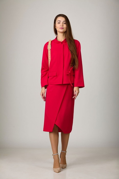 Комплект из костюмной ткани на подкладке, состоящий из жакета и юбки. Жакет прямого силуэта с нагрудными вытачками и прорезными карманами с клапанами. Воротник - стойка. Рукава - реглан, длинные. Жакет застегивается на пришивные кнопки. Цветок ручной работы, расположение можно поменять самостоятельно. Юбка на подкладке, с отлетной деталью и поясом-обтачкой. В среднем шве заднего полотнища юбки - застежка-молния и разрез.