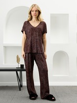 Брючный комплект из костюмной ткани на подкладке. Двубортный жакет выполнен в стиле оверсайз. Воротник-с отложными лацканами пиджачного типа, рукава – двухшовные. По переду- прорезные карманы с клапанами. Жакет имеет два ряда пуговиц, застегивается на две основные пуговицы, одну потайную, остальные пуговицы несут декоративный характер. Изюминка комплекта- декоративная булавка лимонного цвета. Брюки прямые со складкой, широким поясом-обтачкой, наклонными карманами. Застегиваются на молнию по переду и пуговицу. Съемная брошь в виде роскошной хризантемы ручной работы.