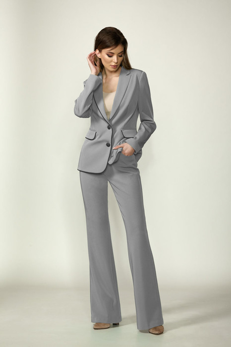 Классический брючный комплект из костюмной ткани на подкладке. Жакет приталенного силуэта с прорезными карманами с клапанами по переду. Воротник-английский, рукава - двухшовные. Кант по краю борта, клапанам добавит стиля и элегантности. Застегивается на две пуговицы. Брюки-клеш расширены к низу, с началом расширения выше колена 5 см. Брюки с двумя карманами и поясом-обтачкой. Застегиваются на молнию по переду и одну пуговицу.