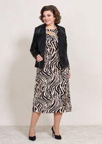 Комплект из костюмной ткани на подкладке, состоящий из жакета и юбки. Жакет приталенного силуэта с прорезными карманами с клапанами по переду. Воротник-английский, рукава - двухшовные. Застегивается на две пуговицы.  Юбка на подкладке, слегка зауженная к низу, с рельефами и поясом.  В среднем шве заднего полотнища юбки - застежка-молния и шлица. Кант по краю борта, клапанам и рельефам юбки добавляет стиля и элегантности.