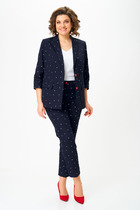 Комплект из костюмной ткани на подкладке, состоящий из жилета и брюк. Жилет приталенного силуэта с прорезными карманами с клапанами по переду. Воротник-английский, рукава - двухшовные. Застегивается на две кнопки. По жилету пришивная аппликация  из черного кружева.Брюки прямого силуэта с наклонными карманами и поясом. Величина пояса регулируется резинкой. Застегиваются на молнию  пуговицу по переду.