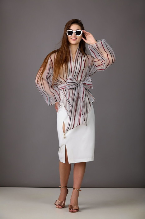 Прозрачная блуза из вуали немного расширена к низу, с планкой по горловине и бортам. Рукава-балон. Завязывается на пояс.