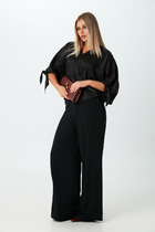 Комплект, состоящий из блузы и платья-комбинации. Прозрачная блуза из вуали  немного расширена к низу, с планкой по горловине и бортам.  Рукава-балон. Завязывается на пояс. Платье-комбинация из плотного атласа. Крой выполнен по косой, что обеспечит великолепную посадку на фигуре. Бретели  регулируемые.