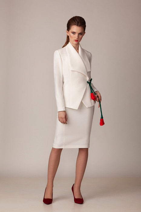 Роскошный комплект из стрейчевой костюмной  ткани на подкладке, состоящий из жакета и юбки.  Двубортный  жакет с рельефами по переду, с завязками из ярких цветов ручной работы, выполненных из атласа,  и потайной пуговицей, с помощью которых можно легко регулировать ширину. Воротник - апаш. Рукава - длинные, двухшовные. Юбка на подкладке, с рельефами, слегка зауженная к низу, с поясом. В среднем шве заднего полотнища юбки - застежка-молния и шлица. Длина жакета по спинке 60 см,по переду - 66см, длина рукава 63 см, длина юбки 67 см.