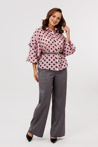 Брючный комплект из костюмной ткани на подкладке.  Жакет с расширенной линией плеч, с отрезными бочками по переду и спинке и вытачками по переду. Воротник-с отложными лацканами пиджачного типа. По переду - прорезные  карманы  с клапанами. Рукава длинные, двухшовные. Жакет застегивается на три пуговицы. Брюки прямые со складкой, широким поясом-обтачкой, наклонными карманами. Застегиваются на молнию по переду  и пуговицу.
