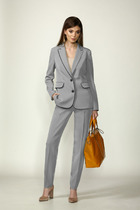 Брючный комплект из костюмной ткани на подкладке. Двубортный жакет полуприталенного силуэта с отрезными бочками и вытачками по переду и спинке. Воротник-с отложными лацканами пиджачного типа. По переду - прорезные  карманы  с клапанами. Рукава длинные, двухшовные. Жакет застегивается на две пуговицы. Жакет декорирован цветами-брошами ручной работы. Брюки узкие, с двумя карманами и поясом-обтачкой.  Застегиваются на молнию по переду и  одну пуговицу.