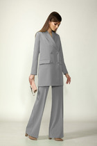 Брючный комплект из костюмной ткани на подкладке. Двубортный жакет полуприталенного силуэта с отрезными бочками и вытачками по переду и спинке. Воротник-с отложными лацканами пиджачного типа. По переду - прорезные  карманы  с клапанами. Рукава длинные, двухшовные. Жакет застегивается на две пуговицы. Брюки узкие, с двумя карманами и поясом-обтачкой.  Застегиваются на молнию по переду и  одну пуговицу.