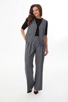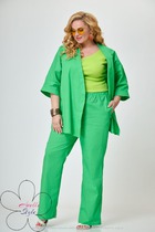 Брючный комплект из костюмной ткани на подкладке. Двубортный жакет полуприталенного силуэта с отрезными бочками и вытачками по переду и спинке. Воротник-с отложными лацканами пиджачного типа. По переду - прорезные  карманы  с клапанами. Рукава длинные, двухшовные. Жакет застегивается на две пуговицы. Жакет декорирован цветами-брошами ручной работы. Брюки прямые со складкой, широким поясом-обтачкой, наклонными карманами. Застегиваются на молнию по переду  и пуговицу.