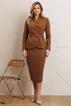 Брючный комплект из костюмной ткани на подкладке. Двубортный жакет полуприталенного силуэта с отрезными бочками и вытачками по переду и спинке. Воротник-с отложными лацканами пиджачного типа. По переду - прорезные карманы с клапанами. Рукава длинные, двухшовные. Жакет застегивается на две пуговицы. Жакет декорирован цветами-брошами ручной работы. Брюки прямые со складкой, широким поясом-обтачкой, наклонными карманами. Застегиваются на молнию по переду и пуговицу.