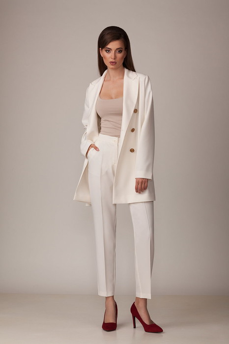 Двубортный жакет выполнен в стиле оверсайз. Воротник-с отложными лацканами пиджачного типа, рукава – двухшовные. Карманы в боковых швах. Жакет имеет два ряда пуговиц, застегивается на две основные пуговицы, одну потайную, остальные пуговицы несут декоративный характер.