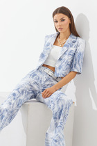 Роскошный комплект из стрейчевой костюмной  ткани на подкладке, состоящий из жакета и юбки.  Двубортный  жакет с рельефами по переду, с завязками из атласа  и потайной застежкой, с помощью которых можно легко регулировать ширину. Воротник - апаш. Рукава - длинные, двухшовные. Юбка на подкладке, с рельефами, слегка зауженная к низу, с поясом. В среднем шве заднего полотнища юбки - застежка-молния и шлица. Длина юбки-67 см.