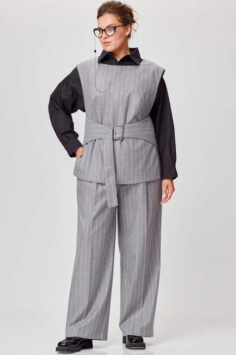Стильный офисный вариант костюма. 2-х предметный, выполнен из костюмной ткани средней плотности. Интересный жилет с застежкой на пояс, который позволит регулировать ширину на уровне талии.   Брюки  классические со складками  по передним половинкам, функциональные карманы. Пояс  частично на резинке.