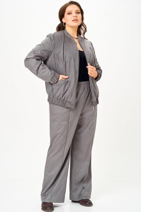 Повседневный вариант брючного костюма. Комфортный и стильный. Костюм состоит из бомбера на поливискозной подкладке. Комфортный  и универсальный в сочетании с другими предметами гардероба. Брюки  свободного кроя, пояс на круговой резинке,  боковые функциональные карманами, по передним половинкам отстрочка.Посадка высокая комфортная, линии — чистые и вытянутые, поэтому костюм одинаково хорошо смотрится на девушках, женщинах высокого, среднего и невысокого роста.