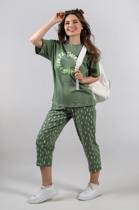Костюм молодежный из трикотажного полотна «кулирка» в комбинации двух видов полотна в единой цветовой гамме: гладкокрашеного и с набивным рисунком, состоящий из футболки и брюк.