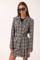 Жакет двубортный без застежки, с накладными карманами и отложным воротником с лацканами. Вытачки по линии груди.  Жакет без подкладки.