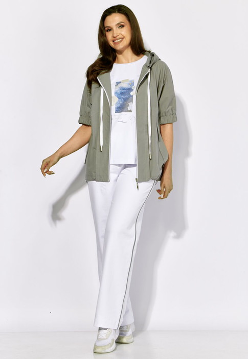 Ветровка прямого силуэта с коротким цельнокроеным рукавом. По низу рукава манжета с резинкой. По переду планки, рельефы и наклонные карманы с клапанами. Застежка центральная на "молнию". Горловина оформлена капюшоном с кулисой из отделочного шнура. По спинке средний шов, подрез и декоративная нашивка. Низ куртки по спинке чуть опущен, с притачной планкой и кулисой из резинки с фиксаторами, для регулировки ширины по низу.
