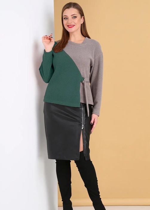 Джемпер свободного кроя, со спущенной линией плеча, выполнен из мягкого, приятного к телу трикотажа. На переде обработан наклонный декоративный шов с разрезом и пояс, крепящийся на два полукольца. Горловина асимметричная, обработана планками.