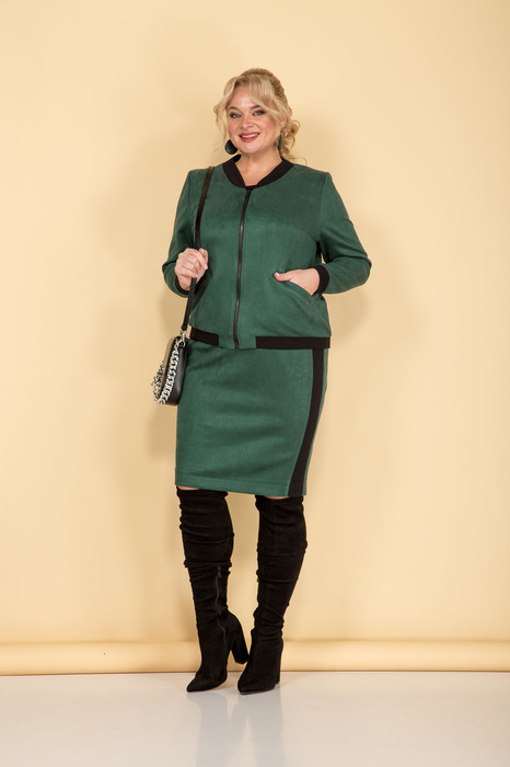 Бомбер и юбка выполнены из бархатистой эко-замши на трикотажной основе. Бомбер на застёжке-молнии. На полочках обработаны нагрудные вытачки и прорезные карманы с листочкой. Рукав втачной, длинный. Низ рукава, горловина и низ бомбера оформлены трикотажным полотном.