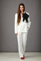 Жакет полуприлегающего силуэта с центральной застёжкой на планку(6 петель и пуговиц). На переде обработаны кокетки, нагрудные вытачки, рельефные швы, карманы с листочками в швах, накладные карманы. Спинка с кокеткой, средним швом, рельефными швами. Рукав втачной, двухшовный, с разрезом в локтевом шве, по низу с заложенной складкой и манжетой на пуговице. Воротник стояче-отложной с отрезной стойкой.