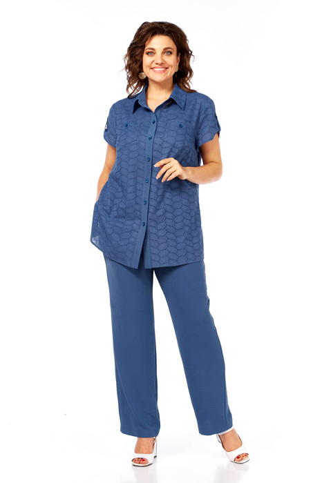 Лёгкий комплект-двойка, состоящий из однотонных брюк и рубашки из хлопка ришелье. Такой комплект подойдёт как для повседневной носки, так и для праздничных мероприятий.