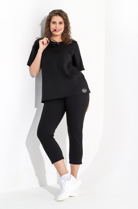 Костюм женский из гладкокрашеного трикотажного полотна футер-двунитка, состоящий из футболки и брюк. Футболка – классического покроя, с короткими втачными рукавами и горловиной овальной формы, обработанной втачной планкой. В нижней части полочки слева настрочен декоративный элемент прямоугольной формы.Брюки – длиной 7/8, слегка зауженные книзу, на притачном поясе с эластичной тесьмой внутри и карманами в боковых швах. Передние половины брюк застрочены по линиям центра вдоль на 0,3 см.