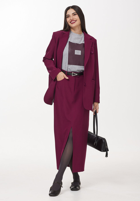 Костюм женский 3-х предметный, состоящий из жакета, юбки и футболки. Жакет и юбка выполнены из костюмной поливискозы, футболка - из хлопкового трикотажа. Жакет на контрастной подкладке. Жакет прямого силуэта, с центральной застежкой на две петли и 2 пуговицы. Перед жакета с нагрудными вытачками и прорезными карманами с листочками. Спинка жакета со средним швом, по низу которого обработана шлица до линии талии. Рукава двухшовные втачные. Горловина оформлена воротником пиджачного типа. Юбка классической формы, cлегка заужена к низу. Верхний срез обработан притачным поясом с резинкой, идущей от бокового шва и по задним половинкам. Перед состоит из 4 частей, рельефы отстрочены декоративной строчкой. По низу центрального рельефа - разрез. В верхней части переда - фигурные карманы. Застежка по переду на тесьму молнию, потайную пуговицу и крючок.  Футболка прямого силуэта с втачным рукавом, декорирована настрочным элементом из эко-кожи с нашивкой. Горловина обработана обтачкой. В комплект входит съёмный ремень.