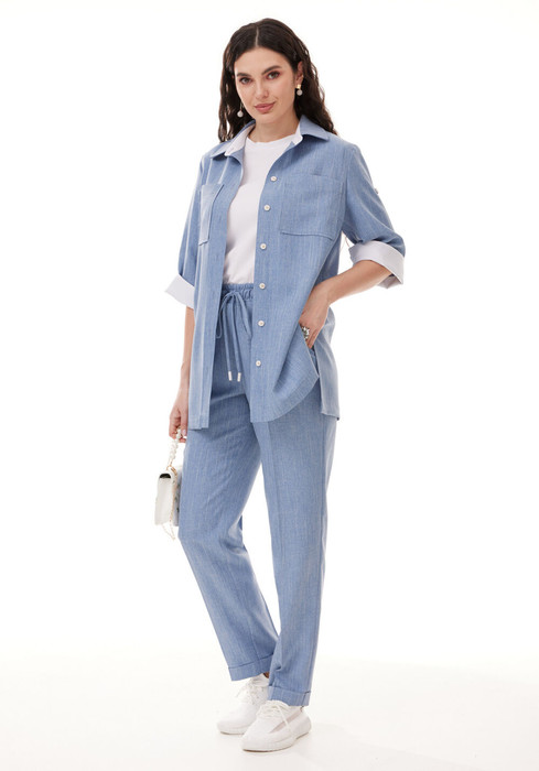 Комплект женский 3-х предметный, состоящий из блузы, брюк и футболки. Блуза и брюки выполнены из поливискозы с добавлением льна. Блуза прямого силуэта, с центральной  застежкой на петли-пуговицы. Горловина оформлена воротником рубашечного типа. Рукава одношовные длиной 3/4, с возможностью подворота длины. Перед с нагрудными выточками, в области груди расположены накладные карманы. Спинка с декоративной кокеткой. По боковым швам блузы - разрезы. Отделочные элементы из контрастной ткани, а также контрастные пуговицы добавляют оригинальность данной модели. Брюки классической формы, слегка заужены к низу, со стрелками. Пояс с резинкой. От боковых швов вставлен  шнур с декоративными наконечниками. По центру переда обработана застежка- обманка. В боковых швах расположены наклонные карманы. По низу брюк - цельнокроенная манжета. Футболка прямого силуэта с втачным коротким рукавом.