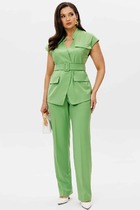 Элегантный костюм-тройка, состоящий из жакета, футболки и брюк. Жакет и брюки выполнены из костюмной ткани, футболка — из трикотажного полотна. Жакет прямого силуэта, с застежкой на две петли и две пуговицы. Перед жакета с нагрудной вытачкой, с прорезными карманами в рамку с клапаном. Спинка жакета со средним швом, заканчивающийся шлицей, левая часть спинки с прорезным карманом в рамку, вход в который фиксирует навесная петля с пуговицей. Рукава двухшовные втачные. Горловина оформлена воротником пиджачного типа. Белая футболка прямого силуэта со спущенной линией плеча и втачным рукавом. Горловина обработана трикотажной бейкой из основной ткани. Брюки классической формы, прямого силуэта, со стрелками по передним и задним половинкам. Верхний срез обработан обтачным поясом. На задних половинках расположены талиевые вытачки, с декоративными листочками. В боковых швах брюк - наклонные карманы. Застёжка центральная на тесьму молнию и крючок.