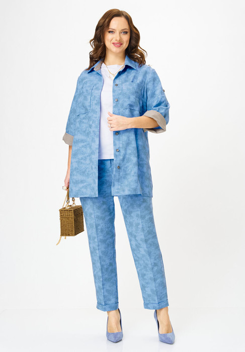 Комплект женский 3-х предметный, состоящий из блузы, брюк и футболки. Блуза и брюки выполнены из поливискозы. Блуза прямого силуэта, с центральной  застежкой на петли-пуговицы. Горловина оформлена воротником рубашечного типа. Рукава одношовные длиной 3/4, с возможностью подворота длины. Перед с нагрудными выточками, в области груди расположены накладные карманы. Спинка с декоративной кокеткой. По боковым швам блузы - разрезы. Отделочные элементы из контрастной ткани, а также контрастные пуговицы добавляют оригинальность данной модели. Брюки классической формы, слегка заужены к низу, со стрелками. Пояс с резинкой. От боковых швов вставлен  шнур с декоративными наконечниками. По центру переда обработана застежка- обманка. В боковых швах расположены наклонные карманы. По низу брюк - цельнокроенная манжета. Футболка прямого силуэта с втачным коротким рукавом.