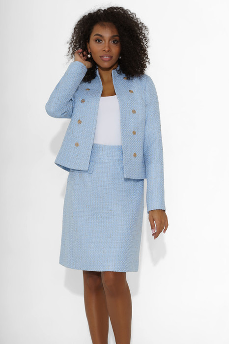 Юбка женская с небольшим расклешением к низу, на подкладке. Переднее полотнище в верхней части юбки с притачной кокеткой, талиевой вытачкой выходящей из кокетки и рельефными швами, выходящими из шва притачивания кокетки до низа. Немного ниже кокетки настрочены клапаны с прямыми углами, закрепленные пуговицей. Спинка юбки с талиевыми вытачками и средним швом, в котором обработана застежка на потайную тесьму-молнию. Средняя длина жакета по среднему шву - 49,0 см, Средняя длина рукава жакета - 61,0 см.