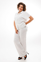 Костюм женский из костюмно-плательной ткани типа Chanel, состоит из жакет полуприлегающего силуэта на подкладке, и юбки-карандаш на подкладке. Костюм может использоваться и как для нарядной, так и для повседневной носки. Жакет женский с центральной бортовой застёжкой до верха на 5 петель и пуговиц (размер и цвет фурнитуры может незначительно отличаться от фото) и отделочной тесьмой с жемчугом, идущей по горловине, вдоль борта, карманам, низу изделия и низу рукавов. Перед жакета с рельефными швами, выходящими из проймы до низа и талиевыми вытачками. Правая полочка с двумя накладными карманами, нижний с прямыми углами и отделочной тесьмой вдоль входа в карман, верхний с закругленными углами и отделочной тесьмой вдоль шва настрачивания кармана, вход верхнего кармана застегивается на 1 петлю и пуговицу. Левая полочка с одним нижним накладным прямоугольным карманам с тесьмой вдоль входа в карман и верхней листочкой обманкой с тесьмой и 1 петлей и пуговицей. Спинка со средним швом и двумя вертикальными рельефными швами, выходящими из проймы до низа изделия. Рукава втачные, двухшовные, длинные. Горловина круглой формы, обтачная. Плечевой пояс оформлен плечевыми накладками.
