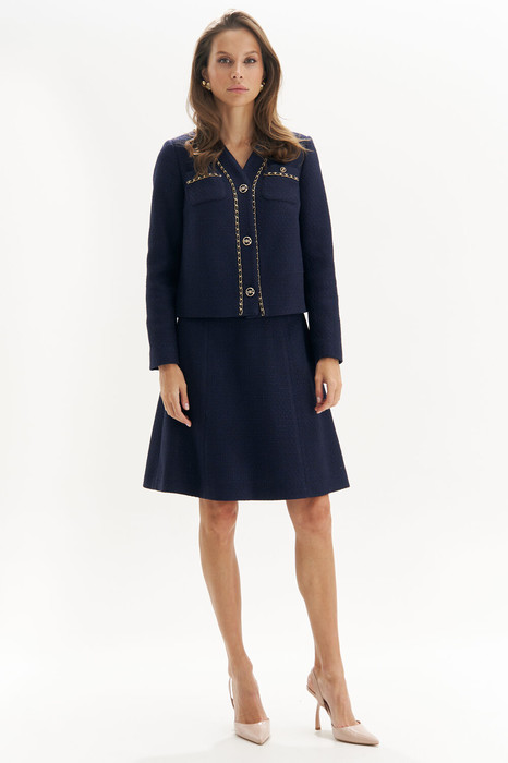 Элегантный твидовый костюм с юбкой — это воплощение классического стиля и утонченности. Жакет с изысканной отделкой цепочкой и пуговицами добавляет нотку роскоши и подчеркивает изящность силуэта. Юбка расширенная к низу обеспечивает комфорт и идеальную посадку, создавая гармоничный и женственный образ. Этот комплект идеально подойдет для деловых встреч, стильных мероприятий или прогулок, где требуется выглядеть элегантно и уверенно. Сочетайте с минималистичными украшениями и обувью на каблуке, чтобы завершить безупречный образ.