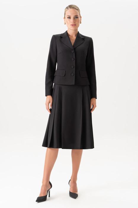 Жакет полуприлегающего силуэта, на подкладке, с центральной бортовой застежкой на 4 петли и 4 пуговицы (размер и цвет фурнитуры может незначительно отличаться от фото). Перед со смещенными рельефными швами, идущими из пройм вниз, с нагрудными вытачками, выходящими из рельефных швов к центрам, в нижних частях с прорезными карманами с клапанами. Спинка с рельефными швами и средним швом. Рукава втачные, двухшовные, длинные. Горловина оформлена воротником пиджачного типа. Концы воротника и лацканов закруглены. По воротнику, лацканам, бортам, клапанам прострочена отделочная строчка ш. 0,7 см.