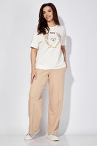 Юбка расклешенная к низу, на отлетной подкладке, на притачном поясе, застегивающимся на 1 петлю и пуговицу. Переднее полотнище с тремя парами складок. Складки частично застрочены от пояса и заутюжены до низа. Заднее полотнище с талиевыми вытачками, со средним швом, в верхней части которого обработана застежка на потайную тесьму-молнию. В 50,52,54 размерах в поясе предусмотрены резинки для лучшего прилегания по талии.