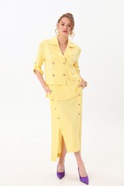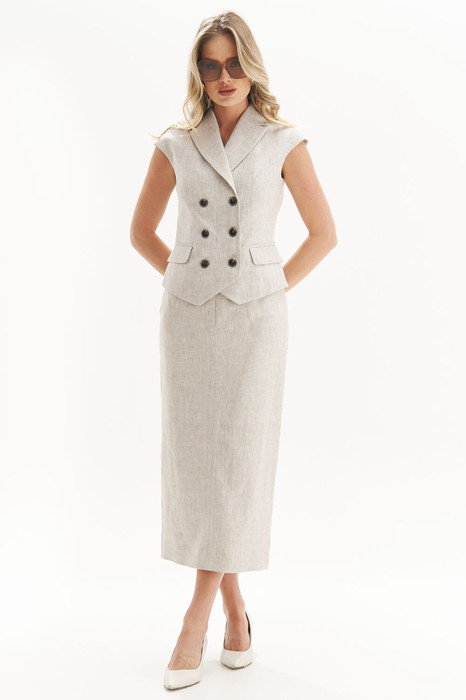 Элегантный костюм из натурального льна — идеальный выбор для теплого сезона. Комплект состоит из приталенного жилета с эффектной двубортной застежкой и прямой юбки миди-длины. Лёгкий оттенок натурального льна делает образ утонченным и универсальным, а современный крой подчеркивает фигуру, сохраняя свободу движений.