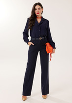 Жилет женский, полуприлегающего силуэта, без подкладки, со спущенной линией плеча, с двубортной застежкой на 3 петли и 6 пуговиц, (размер и цвет фурнитуры может незначительно отличаться от фото). Перед с рельефными швами проходящими через центр груди и идущими из пройм до низа, с наклонной линией низа и расходящимися к низу бортами, в нижней части с прорезными карманами с клапанами и обтачками. Спинка со средним швом, с рельефными швами от пройм до низа. Горловина оформлена воротником пиджачного типа. Проймы обтачные.