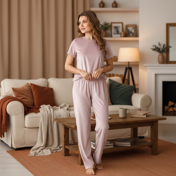 Костюм молодежный из трикотажного полотна «велюр-стрейч», состоящий из футболки и брюк.