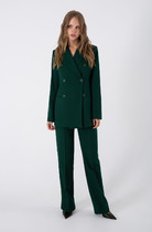 Костюм женский двухпредметный, состоящий из жакета и брюк. Жакет удлиненный полуприлегающего силуэта с центральной бортовой застежкой до линии перегиба лацкана на 4 петли-пуговицы. Перед с фигурным бочком, в котором обработан карман, и талиевой вытачкой. В правом кармане пришит декоративный элемент, на который завязывается съемный бант из подкладочной ткани. Спинка со средним швом. Рукава втачные двухшовные длинные. Воротник пиджачного типа. Брюки, зауженные к низу, с притачным поясом, сзади на резинке. Застежка на тесьму-молнию в средних срезах передних половинок и одну петлю-пуговицу по поясу. На брюках заутюжены стрелки. На задних половинках по низу заложена односторонняя складка с петлей и пуговицей.