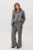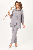 Комплект женский, состоящий из туники и брюк. Туника А-образного силуэта с центральной застежкой на планку до подреза на 3 декоративные петли-пуговицы. Перед с нагрудной вытачкой и фигурными подрезами. Спинка с горизонтальной кокеткой и двумя складками. В боковых швах обработаны разрезы. Низ переда ассиметричен и слегка разведен. Рукава втачные одношовные длиной 3/4 с защипом, имитирующим манжет. Воротник-стойка. Брюки классического кроя, зауженные к низу с притачным поясом сзади на резинке. Застежка на тесьму-молнию в среднем шве передних половинок и 1 петлю-пуговицу по поясу. На брюках заутюжены канты.